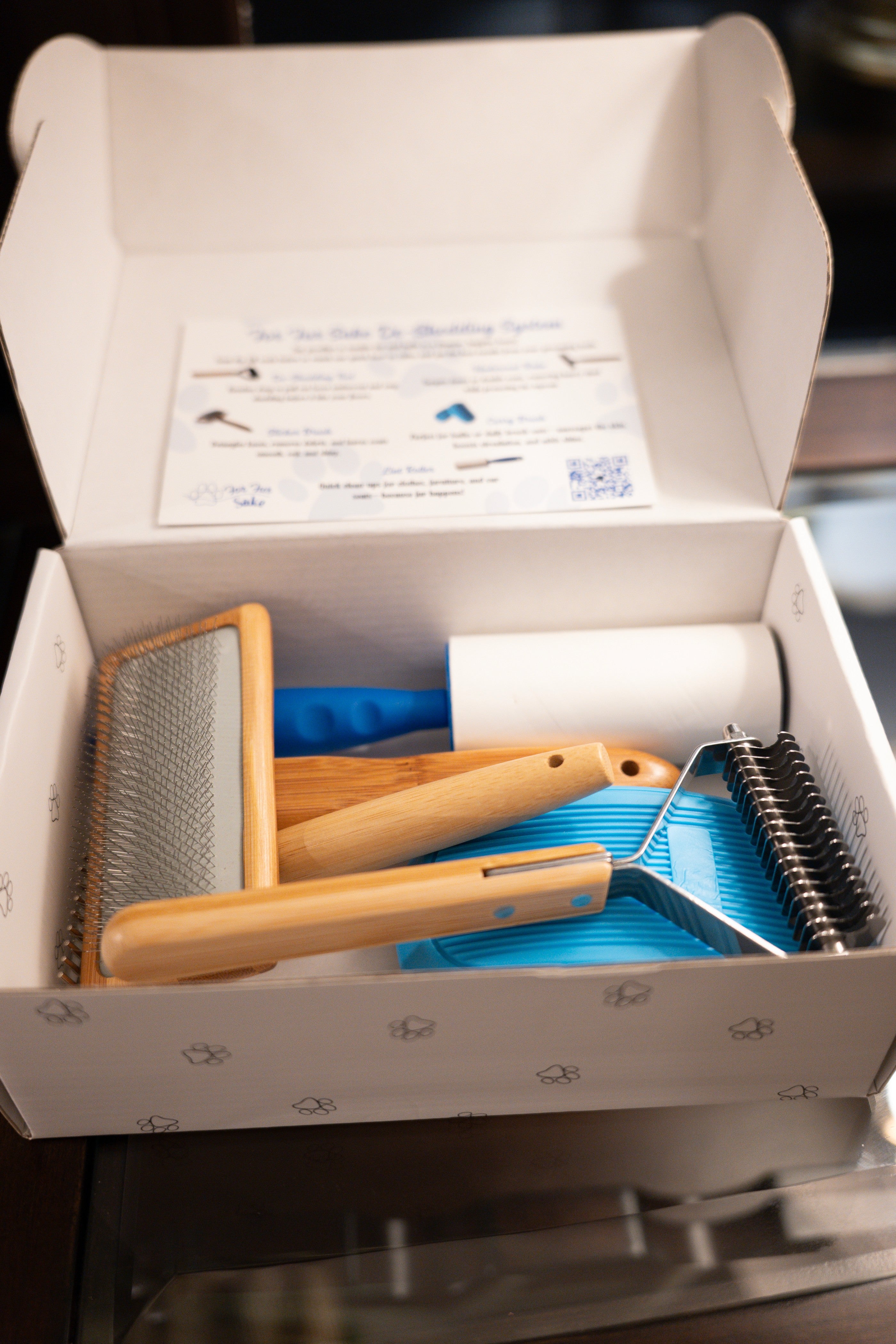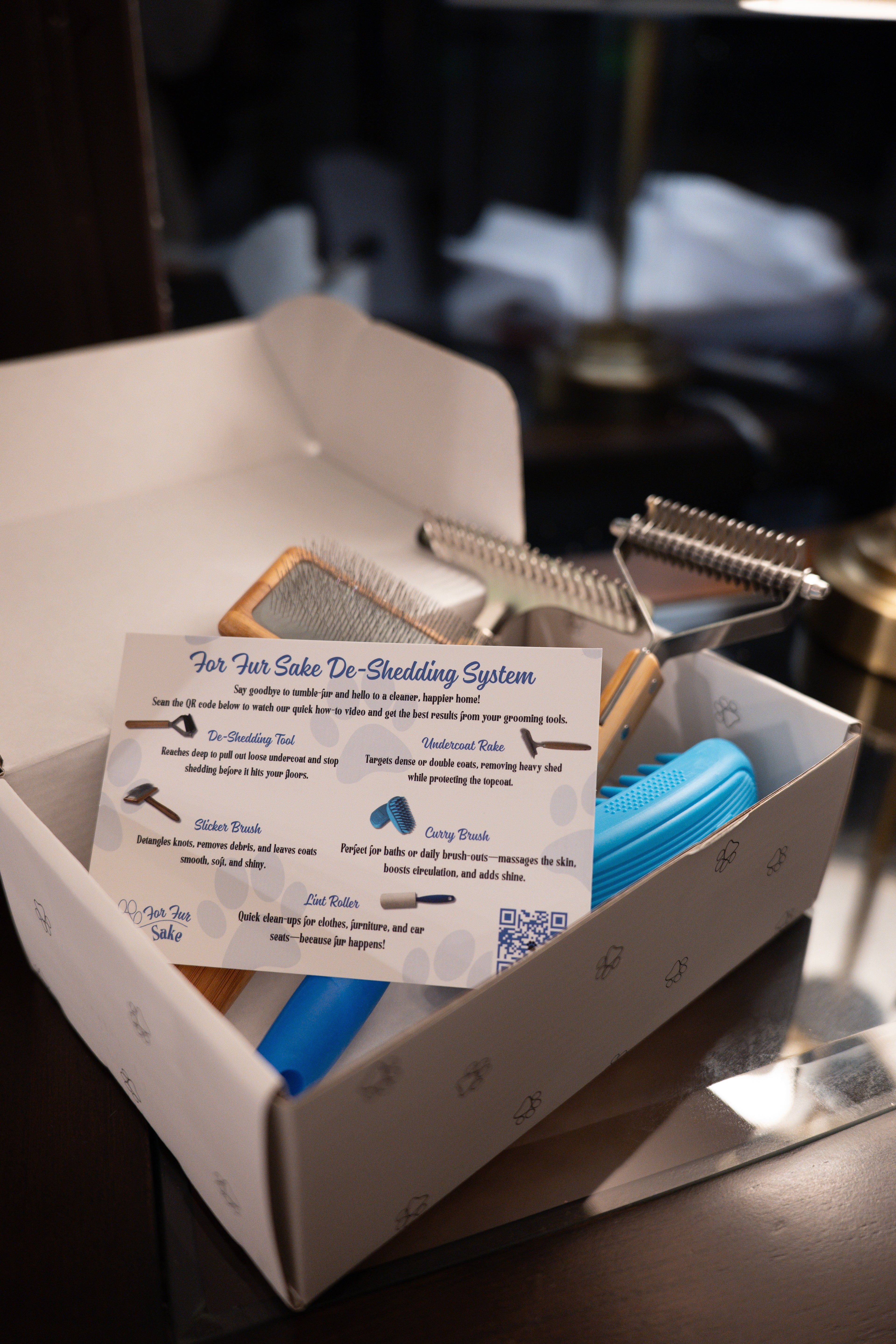 Discover everything you need in one beautifully packaged kit. Our For Fur Sake De-Shedding System includes specialized tools designed to tackle shedding from every angle—keeping your home cleaner and your pet happier.